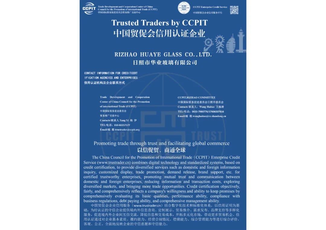 Integrity is the foundation of the market-oriented enterprise. Since its establishment, Huaye Glass has always adhered to the core values of "Dedication, Integrity, Innovation and Transcendence" and regarded integrity as the core competitiveness of the company. Recently, we have applied for and successfully obtained the Enterprise Credit Certification from China Council for the Promotion of International Trade.